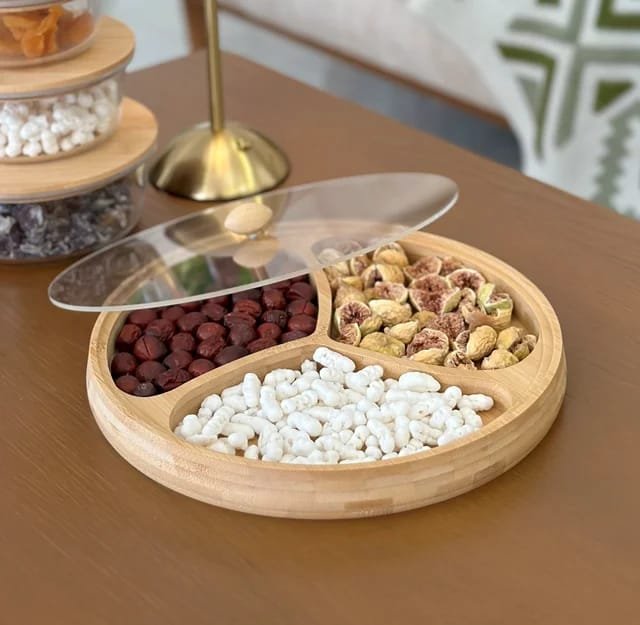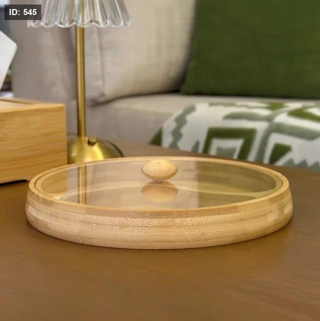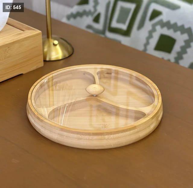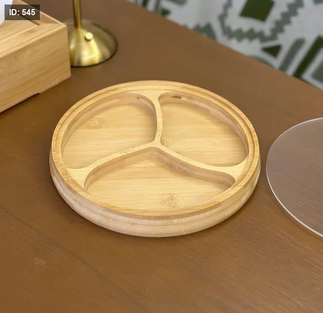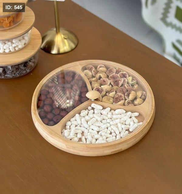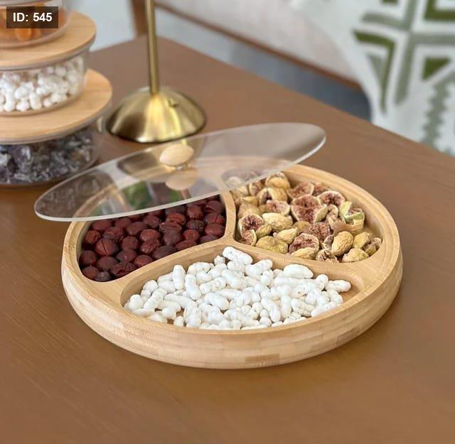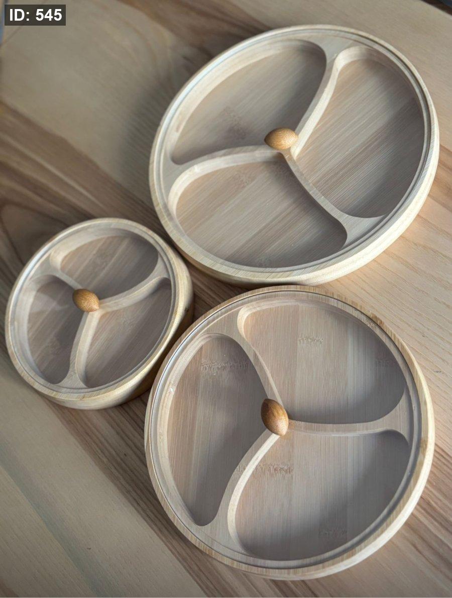 3 صحون مصنوعة من خشب البامبو الطبيعي، مع غطاء أكريليك شفاف يحافظ على النظافة والطزاجة دون أن يُخفي جمال التقديم.