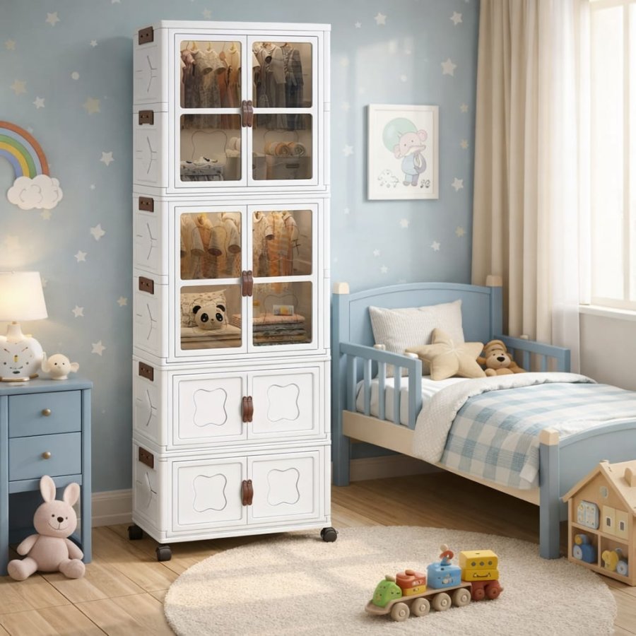 4️⃣ أبواب علوية شفافة لعرض الملابس.